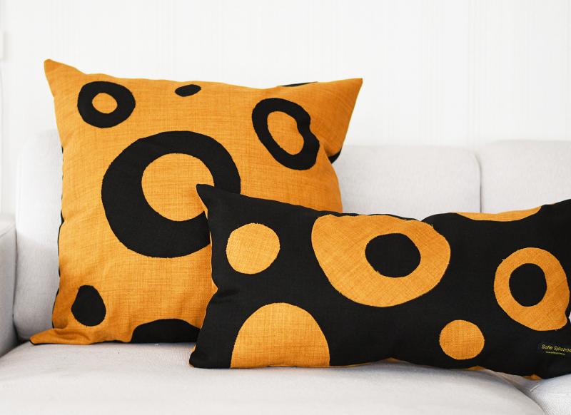 Handmade. Design: Sofie Sjöström. The pattern is sewn with appliqué on the front. The pillow is made of beautifully thicker durable furniture fabric. Dimensions 60x60 cm. Fits on the sofa or as a decoration on the bed.