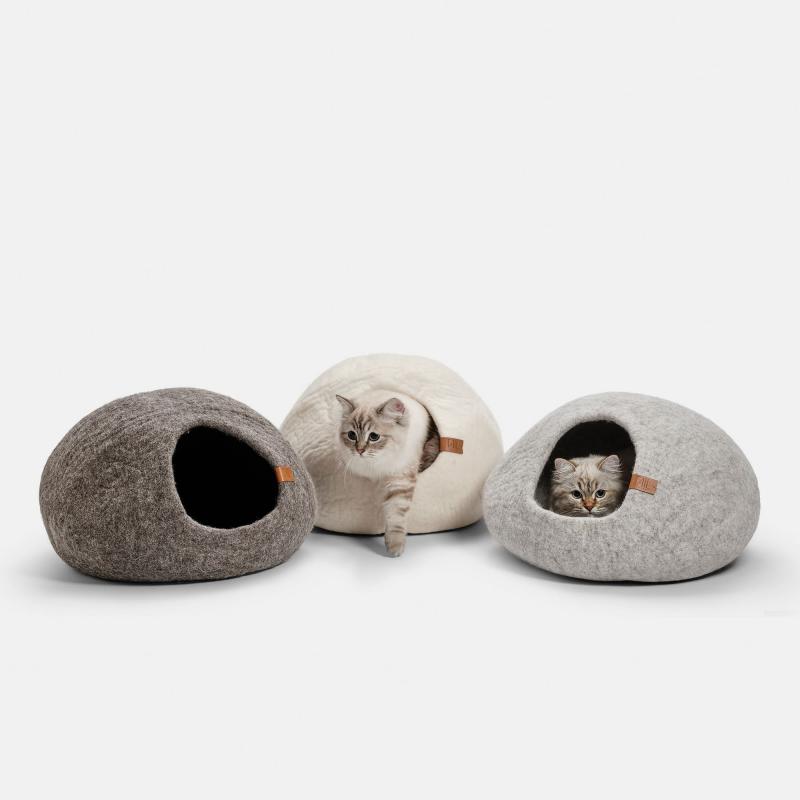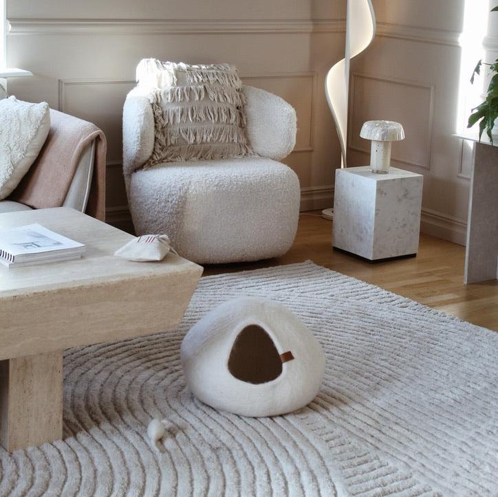 Cassius Cat Cave är en kattbädd handfiltad av 100 % ekologisk ull, vilket gör den till en perfekt plats för din katt att mysa och koppla av. Med sin stilrena design passar den perfekt in i ditt hem. Ullen har ingen utmärkande doft och detta material fungerar som en termostat, vilket gör det idealiskt för att hålla din katt varm på vintern och sval på sommaren. Observera att eftersom kattsängarna är handgjorda kan de variera i form.