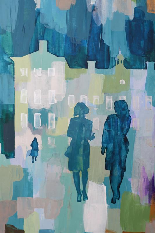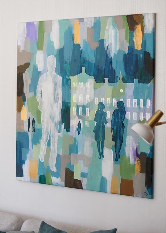 Den här målningen heter kort och gott - Staden. Ser ni torget? Perspektivet ger små och stora människor som passerar och är på väg till kanske ett viktigt möte, en fika på stan eller som bara tar en uppfriskande promenad. Akryl på linneduk av Sofie Sjöström. 2023