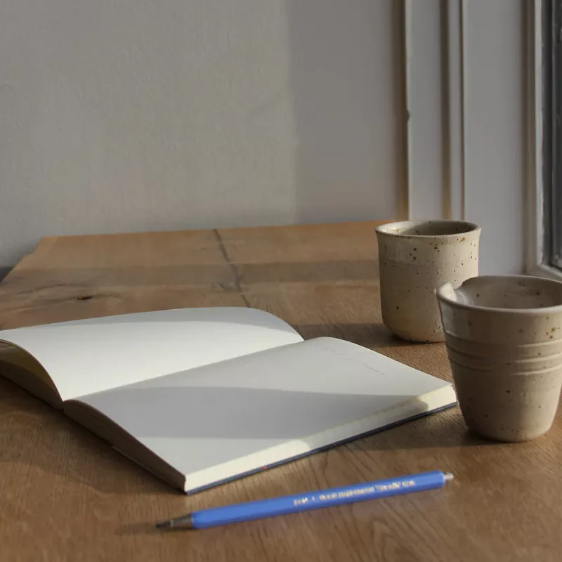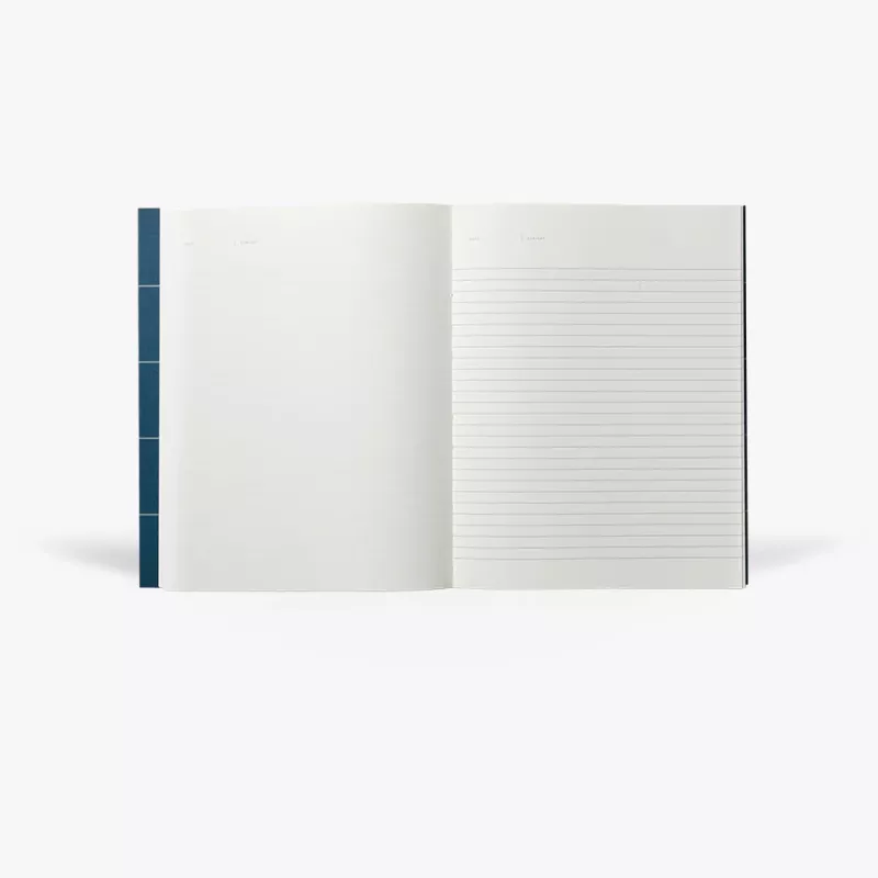 Den här anteckningsboken har en tom olinjerad vänstersida och en linjerad högersida, vilket ger utrymme för skisser, mindmaps, anteckningar och notiser.